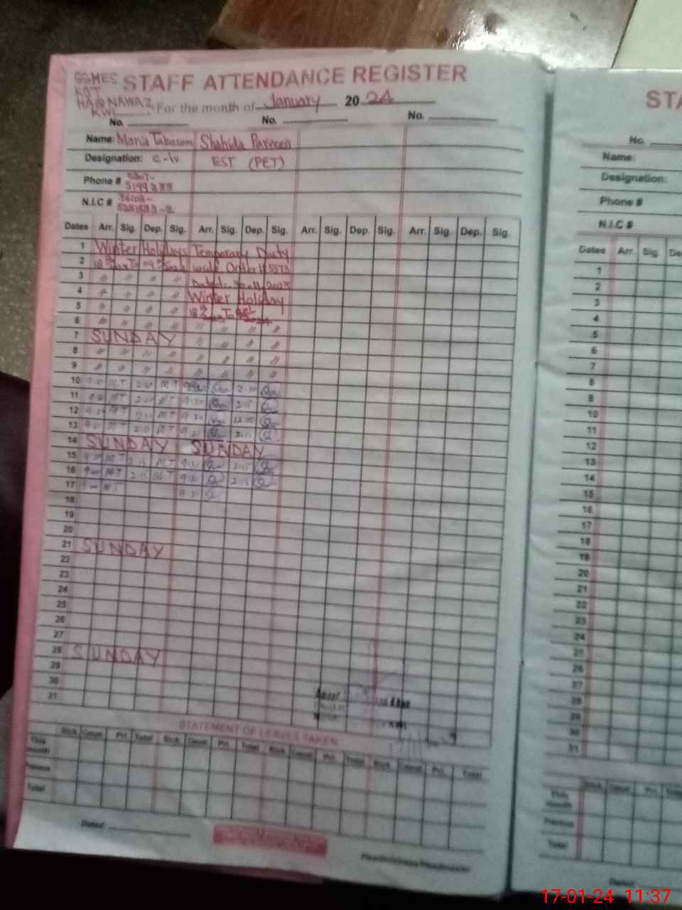 | Remarks (Use Separate Page if Required): EST Arifa Aslam Absent un authorized since 15 November 2022 | |||||