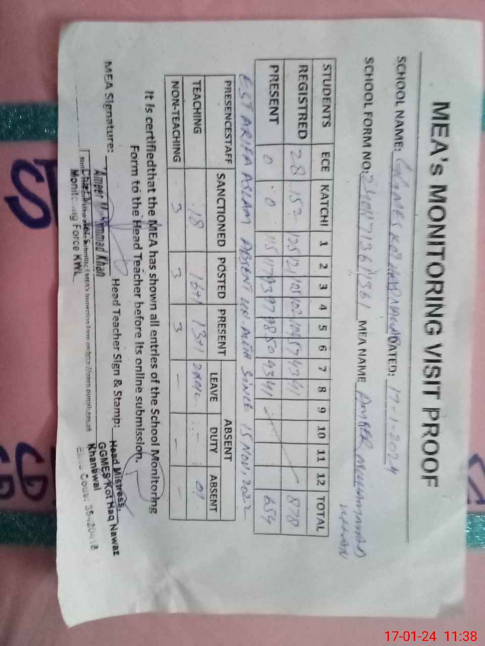 | Attendance Register | Head Teacher | MEA with School | Visit Proof |