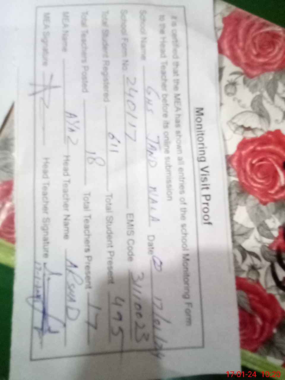 | Attendance Register | Head Teacher | MEA with School | Visit Proof |