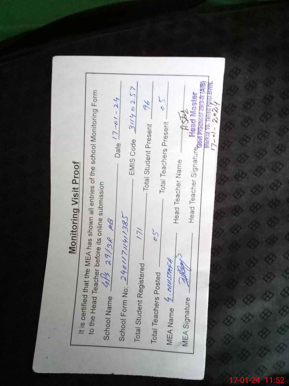 | Attendance Register | Head Teacher | MEA with School | Visit Proof |