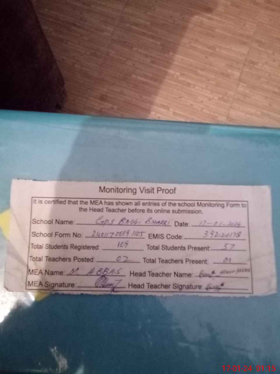 | Attendance Register | Head Teacher | MEA with School | Visit Proof |