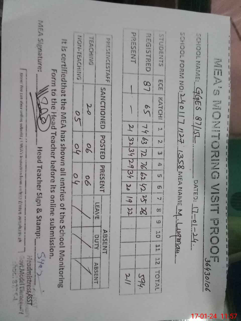 | Attendance Register | Head Teacher | MEA with School | Visit Proof |