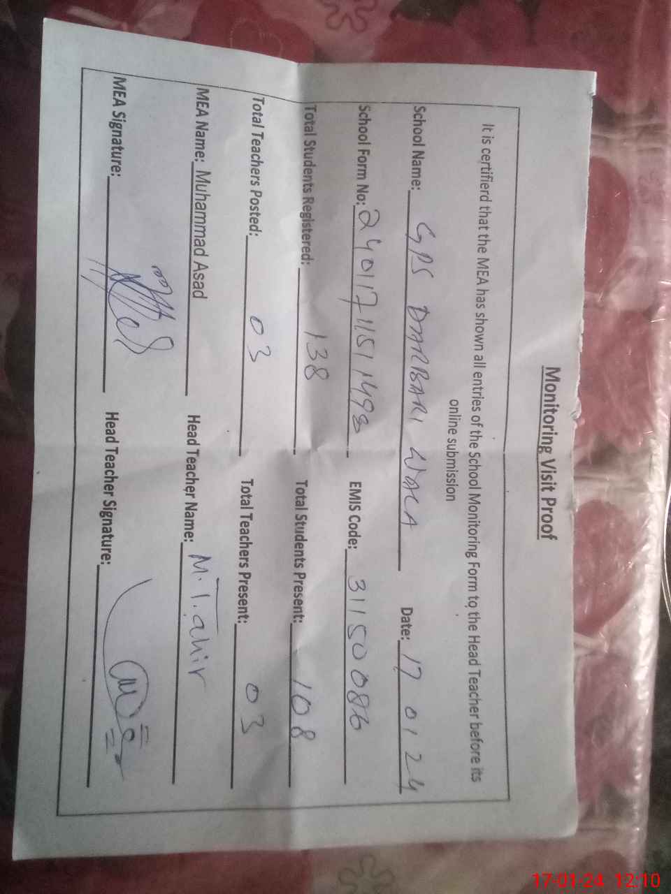 | Attendance Register | Head Teacher | MEA with School | Visit Proof |