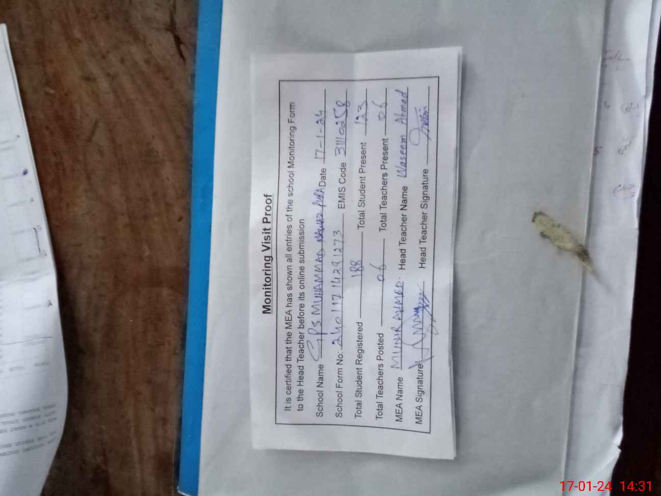 | Attendance Register | Head Teacher | MEA with School | Visit Proof |