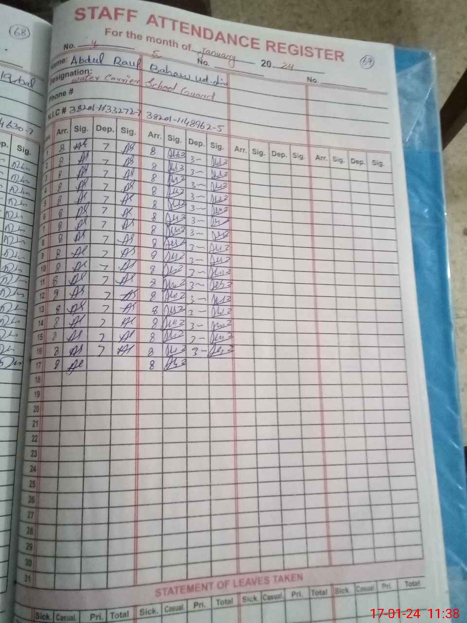 | CNIC | Full Name | Designation | R/C | Absence during last cal. month |