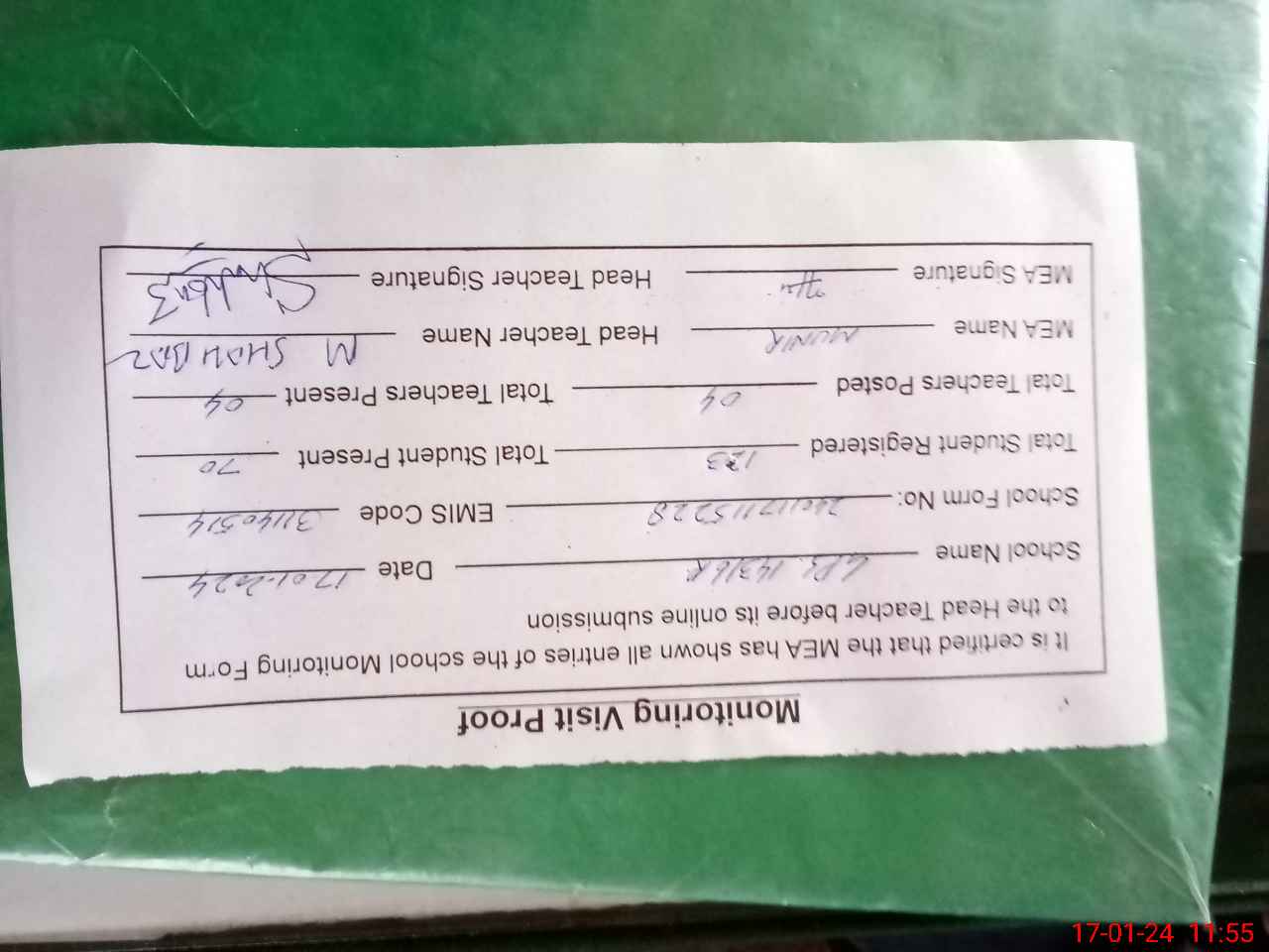 | Attendance Register | Head Teacher | MEA with School | Visit Proof |