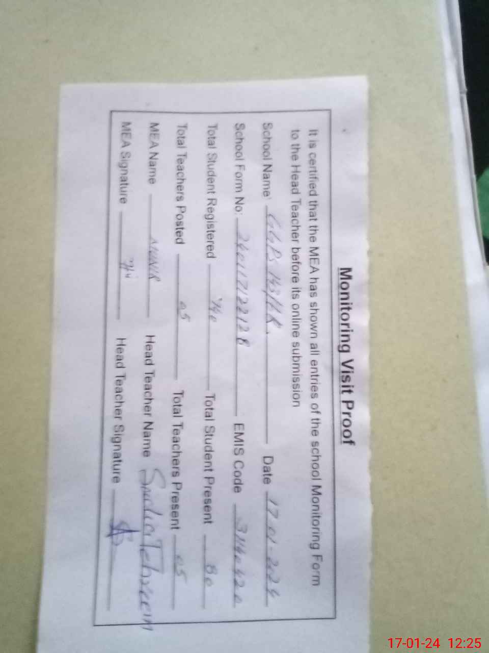 | Attendance Register | Head Teacher | MEA with School | Visit Proof |