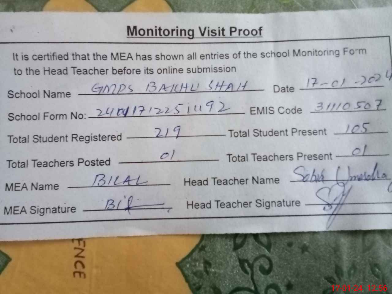 | Attendance Register | Head Teacher | MEA with School | Visit Proof |