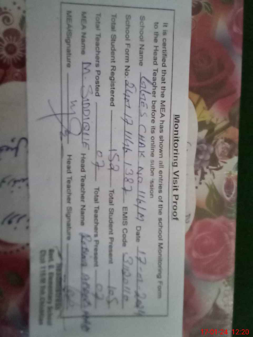 | Attendance Register | Head Teacher | MEA with School | Visit Proof |