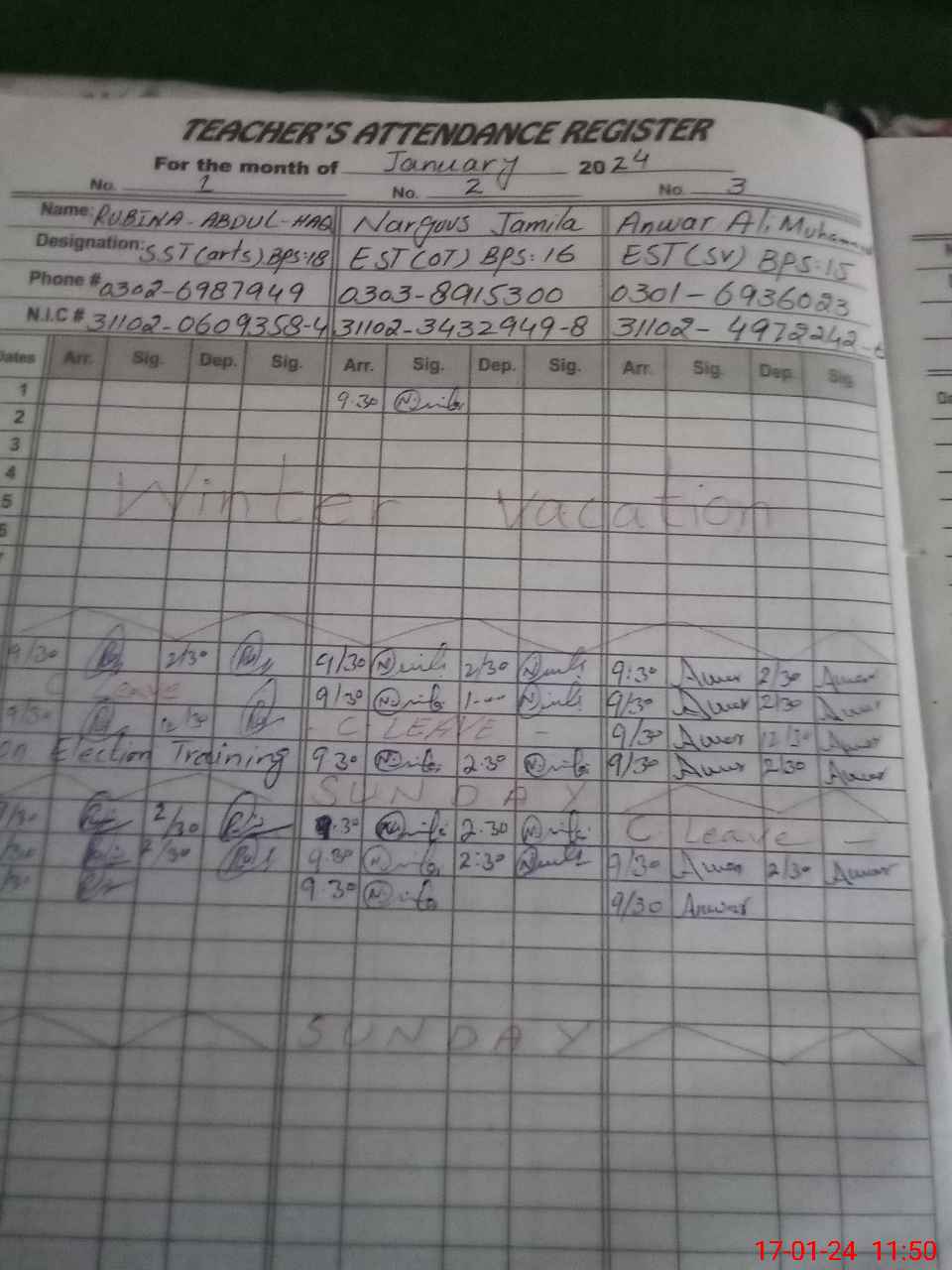 | CNIC | Full Name | Designation | R/C | Absence during last cal. month |