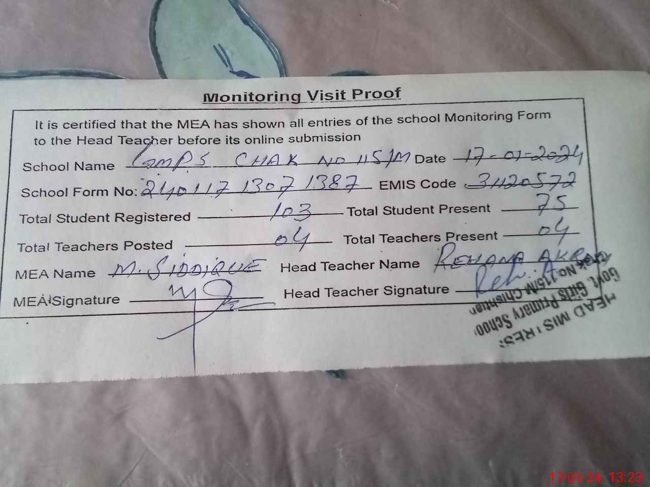 | Attendance Register | Head Teacher | MEA with School | Visit Proof |