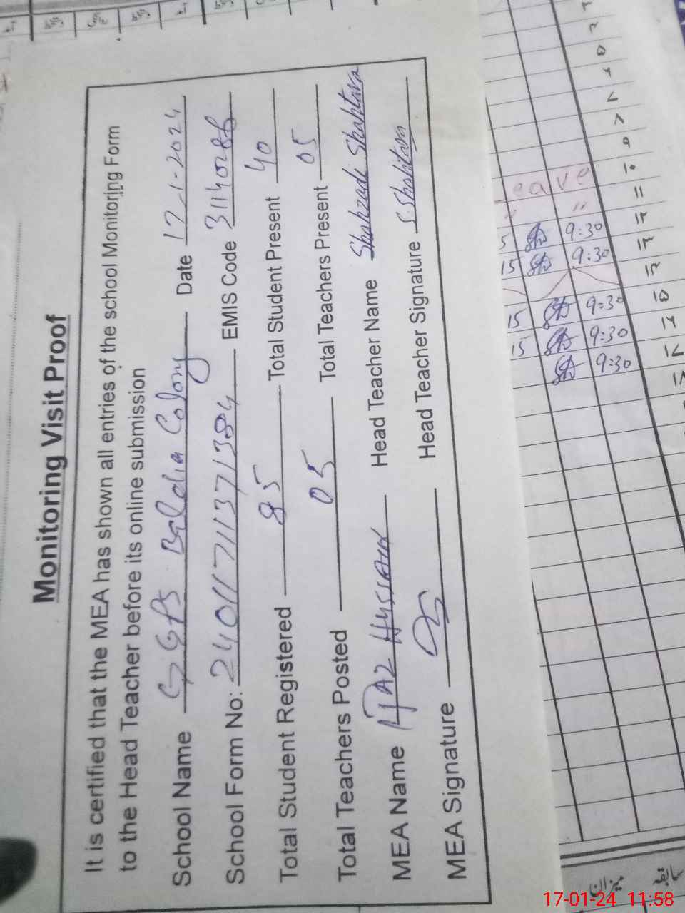 | Attendance Register | Head Teacher | MEA with School | Visit Proof |