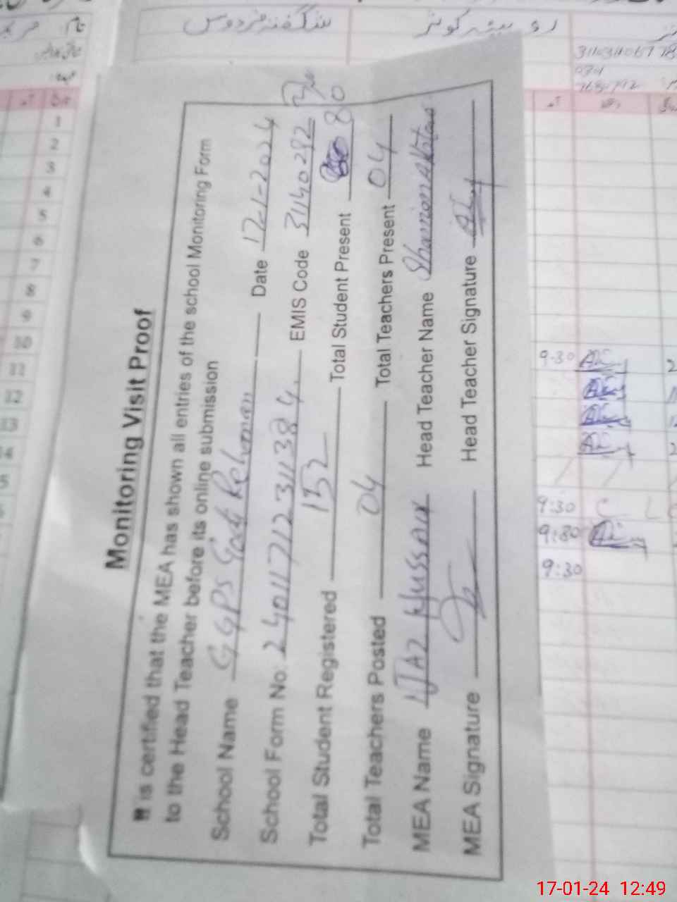 | Attendance Register | Head Teacher | MEA with School | Visit Proof |