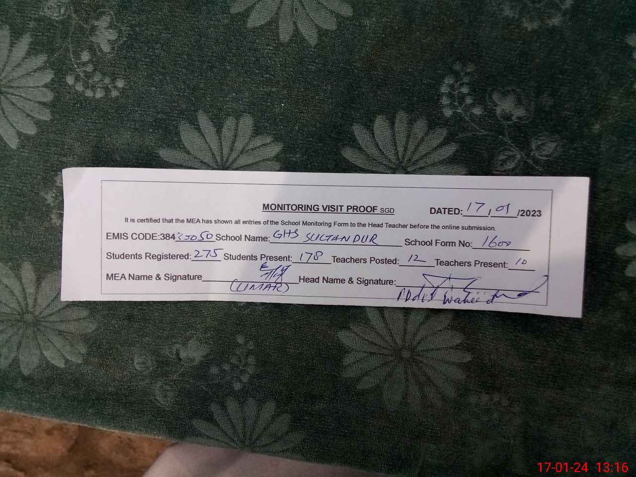 | EMIS Code: 38430050 | Name of School: GHS SULTAN PUR | |||