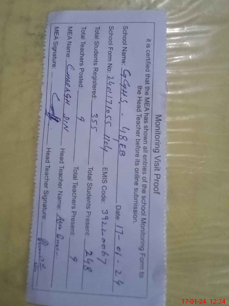 | Attendance Register | Head Teacher | MEA with School | Visit Proof |