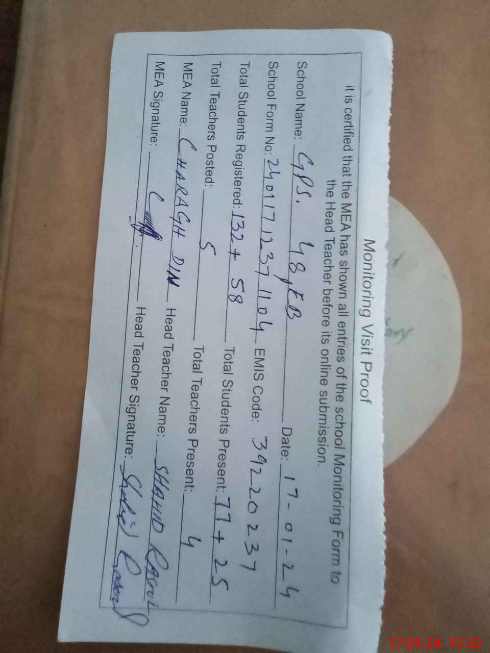 | Attendance Register | Head Teacher | MEA with School | Visit Proof |