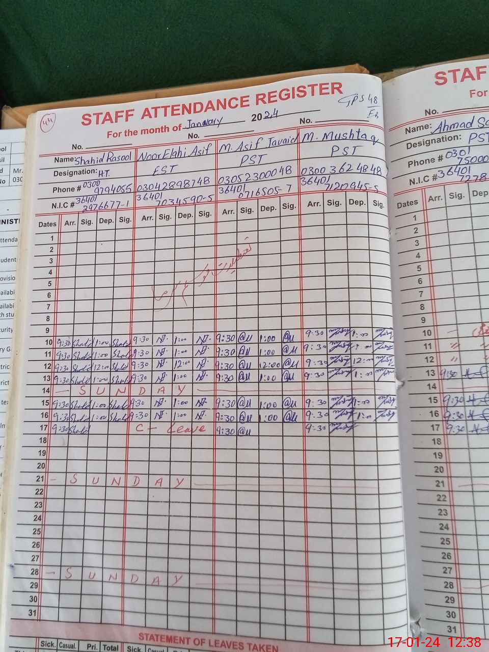 | CNIC | Full Name | Designation | R/C | Absence During Last Calender Month |