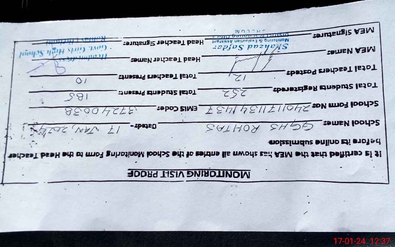| EMIS Code: 37240038 | Name of School: GGHS ROHTAS | |||