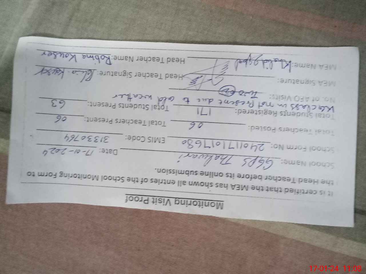 | Remarks (Use Separate Page if Required): Class verification is not updated on MEA tab as per sis and KG class is not present due to cold weather and school has insaf after noon classes with students strength 18 | |||||