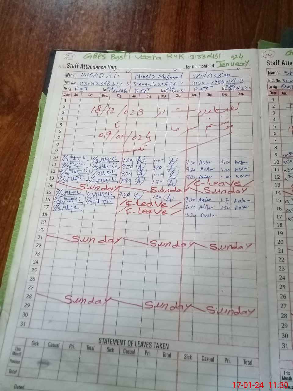 | CNIC | Full Name | Designation | R/C | Absence during last cal. month |