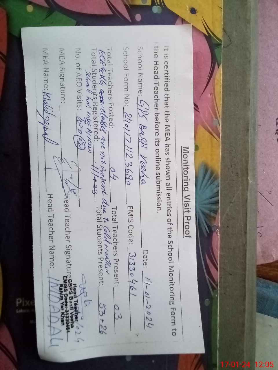 | Remarks (Use Separate Page if Required): Class verification is not updated on MEA tab as per sis and two classes are sitting on open air and school has insaf after noon classes with students strength 33 | |||||