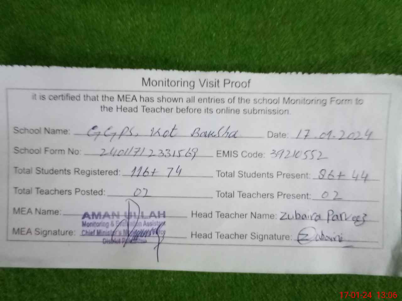 | EMIS Code: 39210552 | Name of School: GGPS KOT BAKHSHA | |||