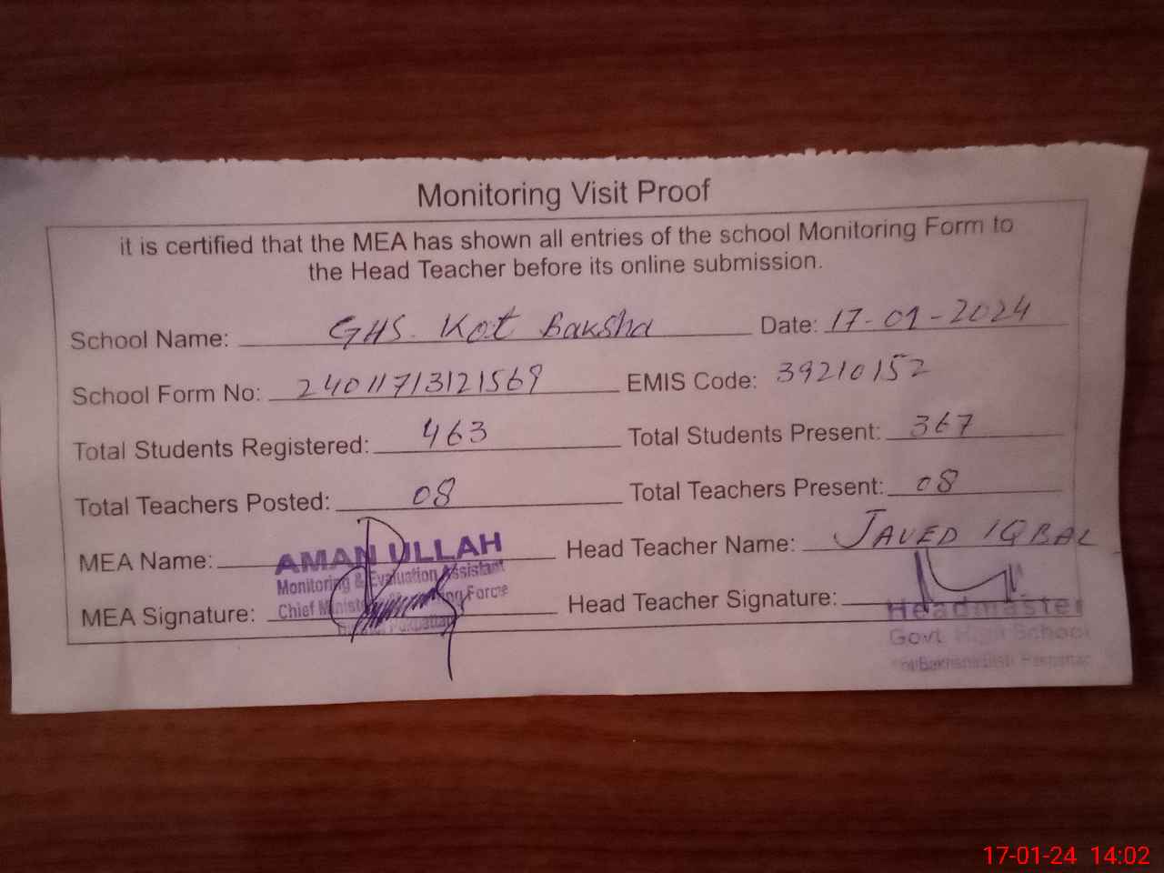 | EMIS Code: 39210152 | Name of School: GHS KOT BAKHSHA | |||