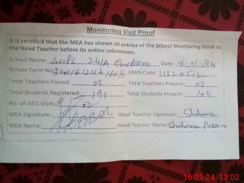 | Certified that this School was Inspected by the Undersigned MEA/DMO Today and the Information Stated Above is as Per Record. | |||||