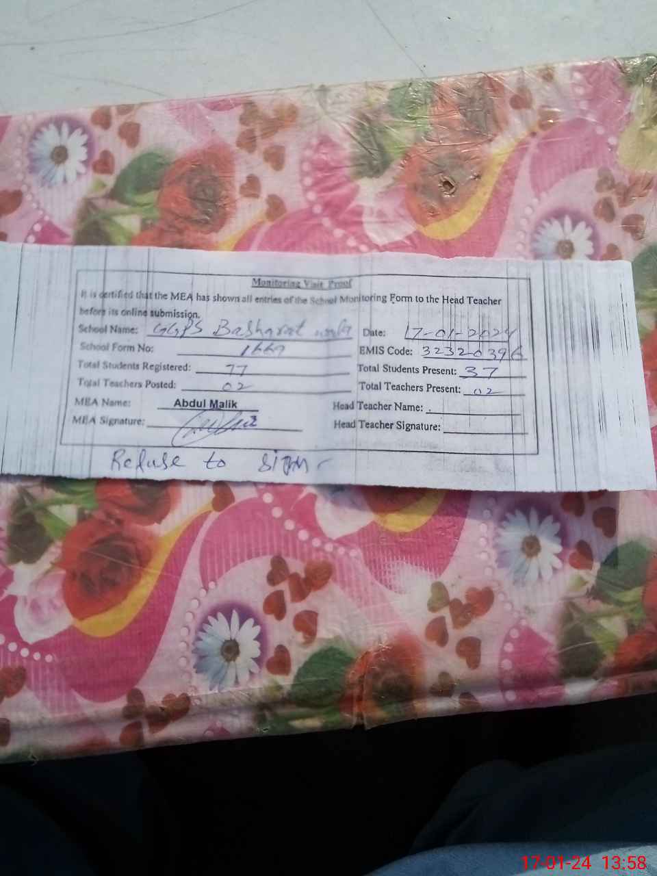 | Remarks (Use Separate Page if Required): Head teacher refuse to sign on visit proof | |||||