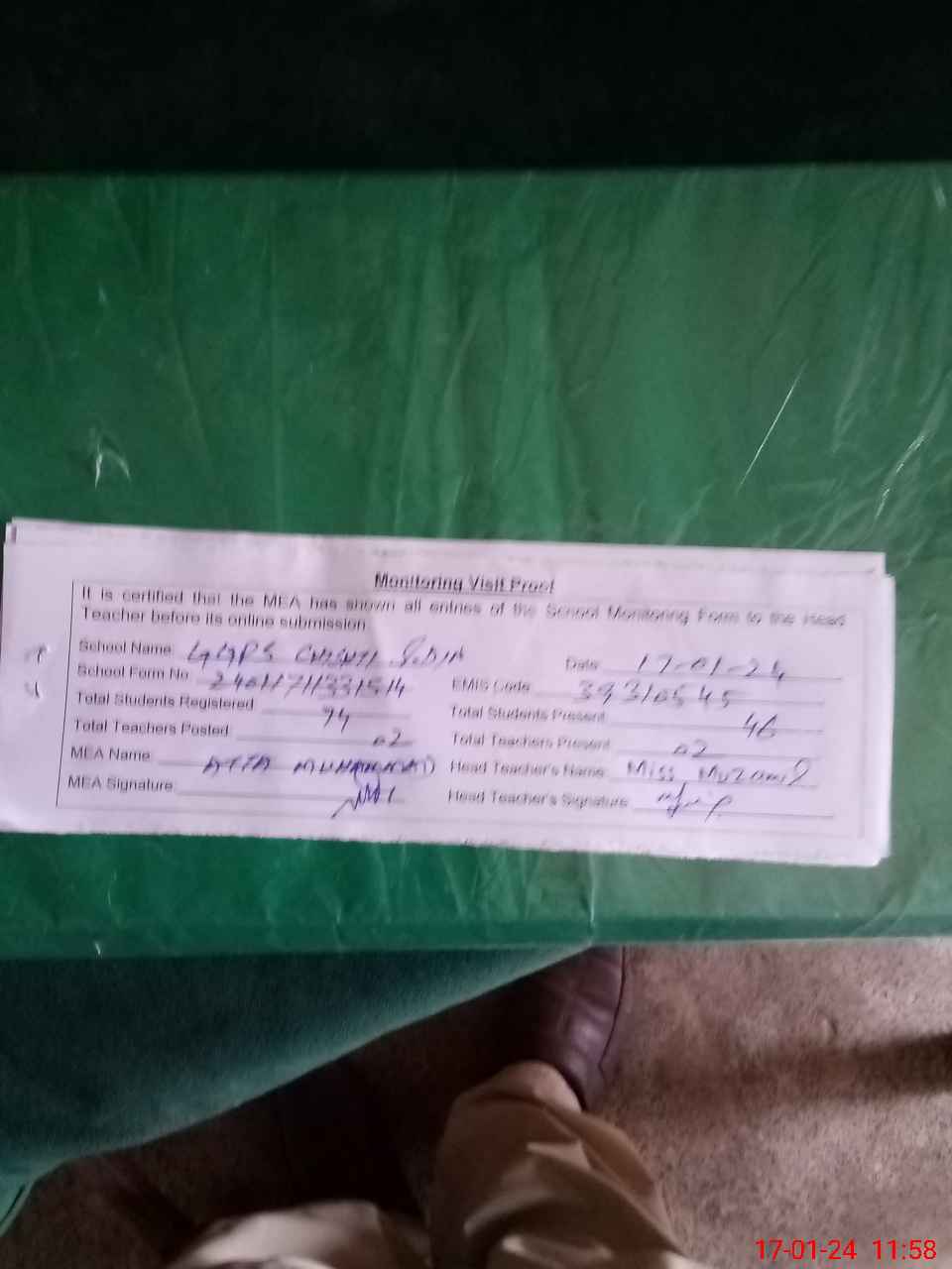 | Attendance Register | Head Teacher | MEA with School | Visit Proof |