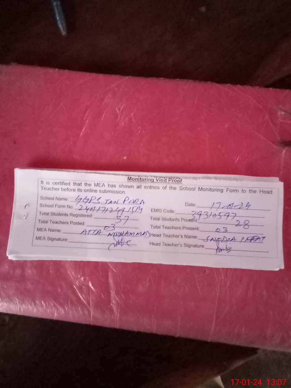 | Attendance Register | Head Teacher | MEA with School | Visit Proof |