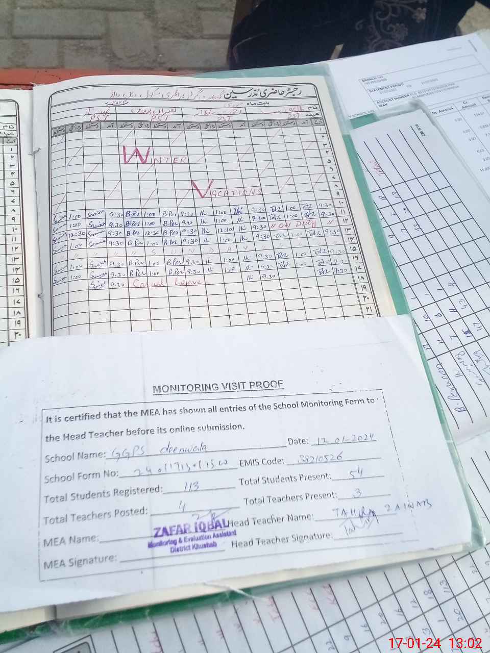 | Attendance Register | Head Teacher | MEA with School | Visit Proof |