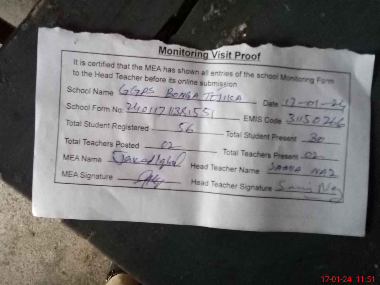 | Attendance Register | Head Teacher | MEA with School | Visit Proof |