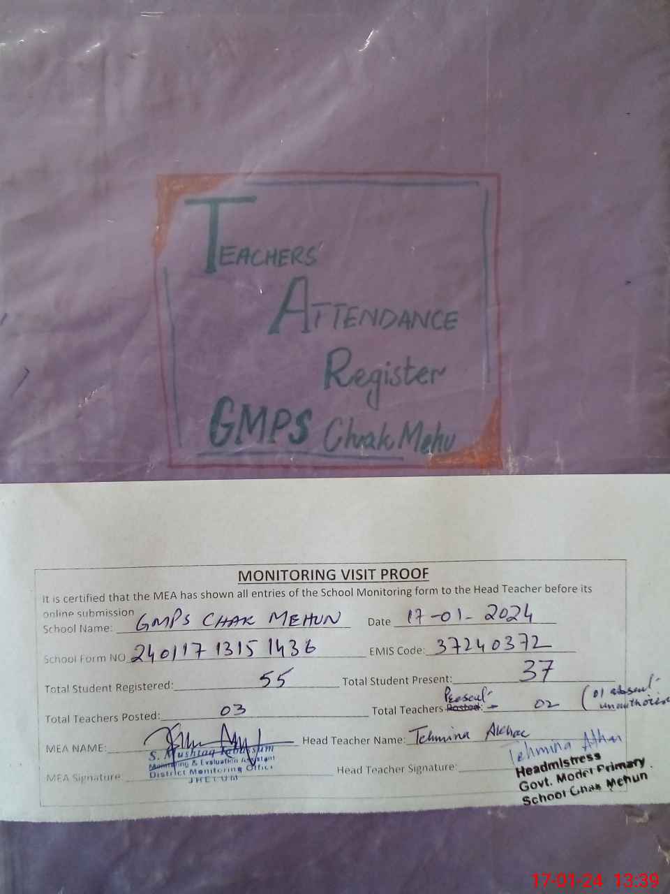 | Attendance Register | Head Teacher | MEA with School | Visit Proof |