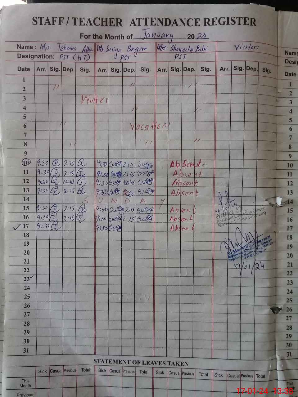 | 37**** | Sh**** Bi**** | 1 | 1 | 0 | 0 | 0 | 0 | 0 | 0 | 0 | 0 | 0 | Absent (Un-Authorized) |