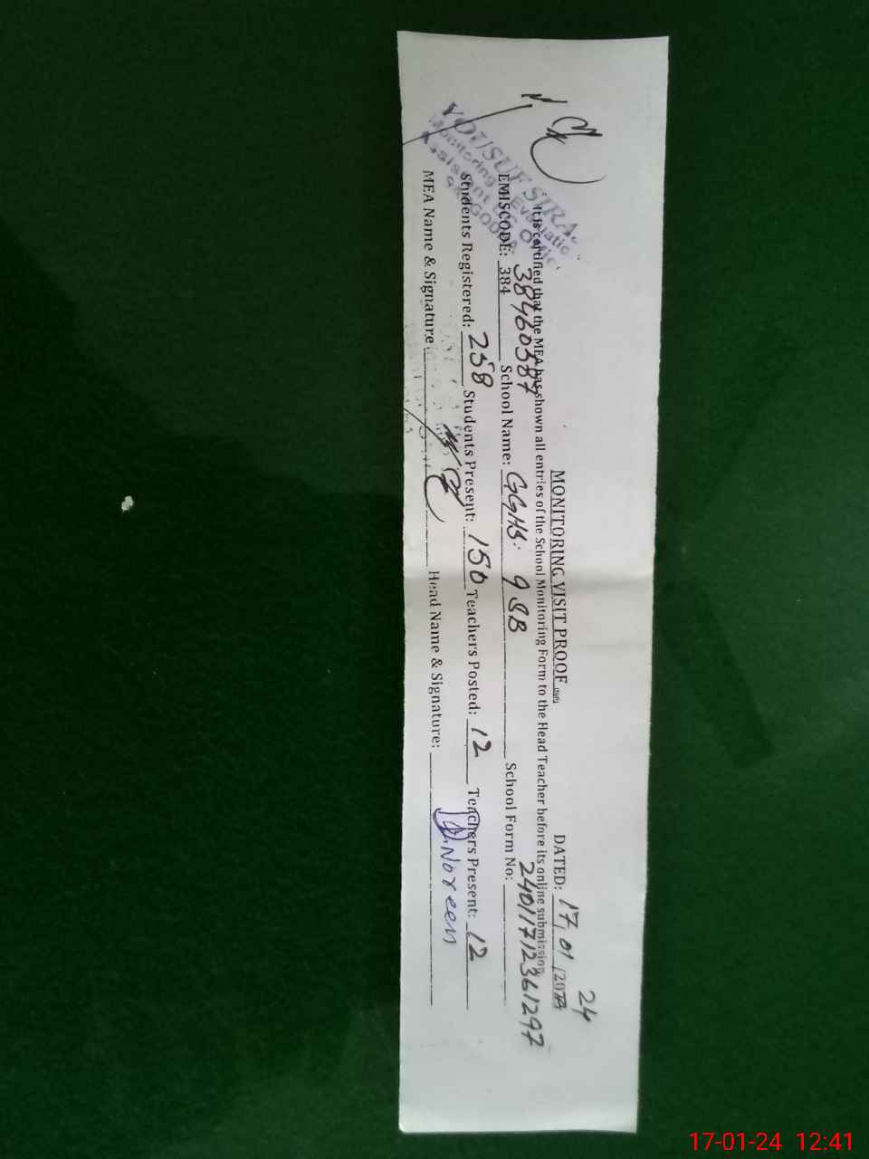 | Attendance Register | Head Teacher | MEA with School | Visit Proof |