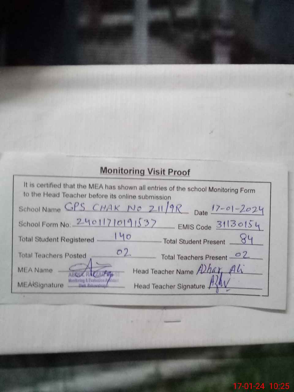 | EMIS Code: 31130154 | Name of School: GPS CHAK NO.211/9-R | |||