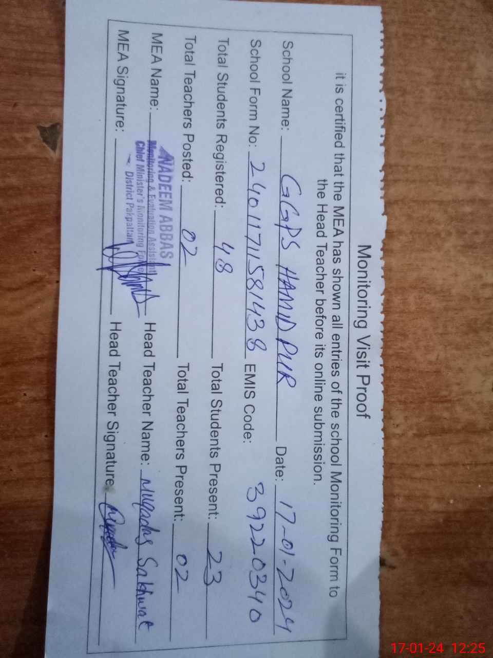| Attendance Register | Head Teacher | MEA with School | Visit Proof |