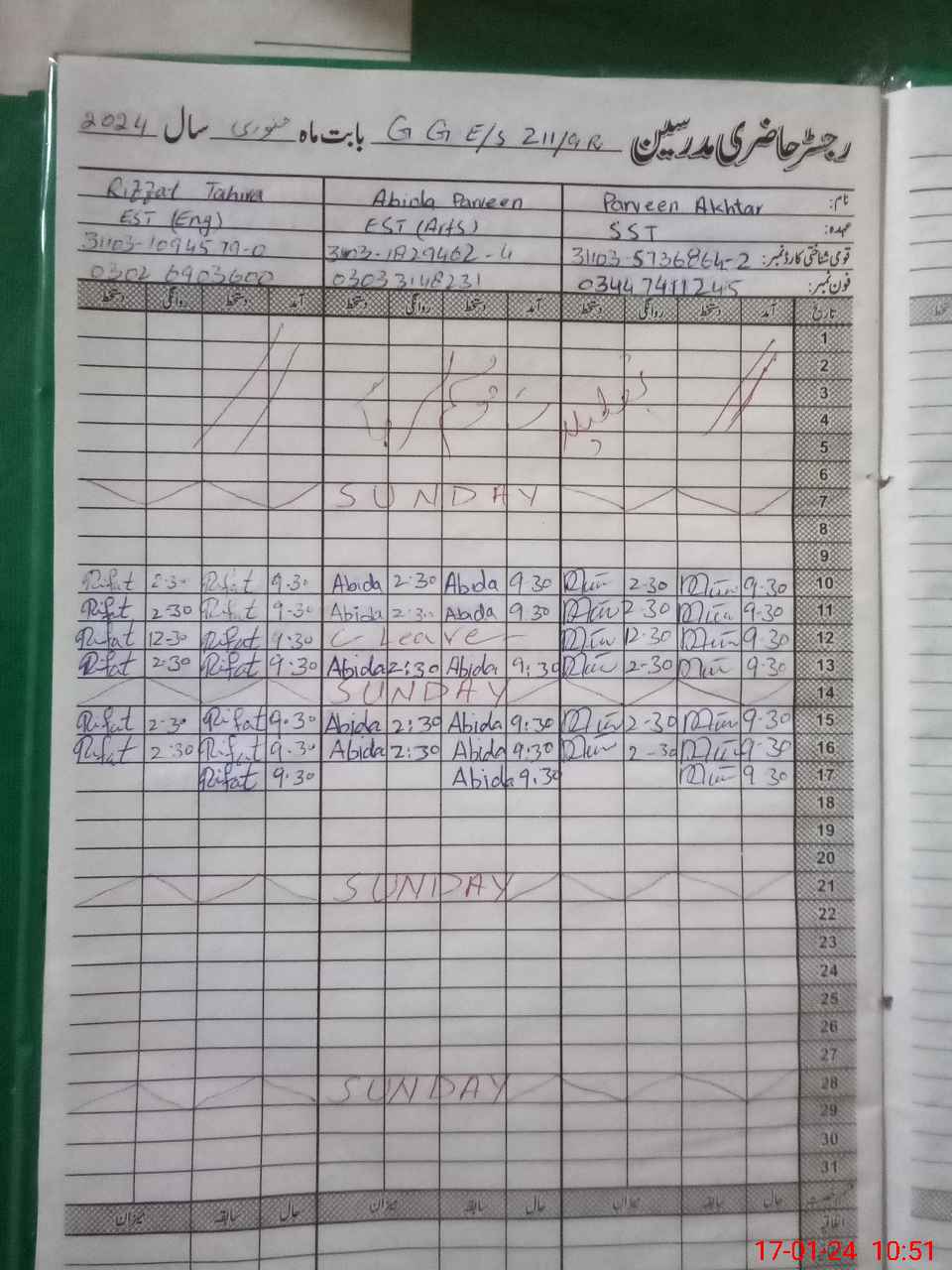 | CNIC | Full Name | Designation | R/C | Absence During Last Calender Month |