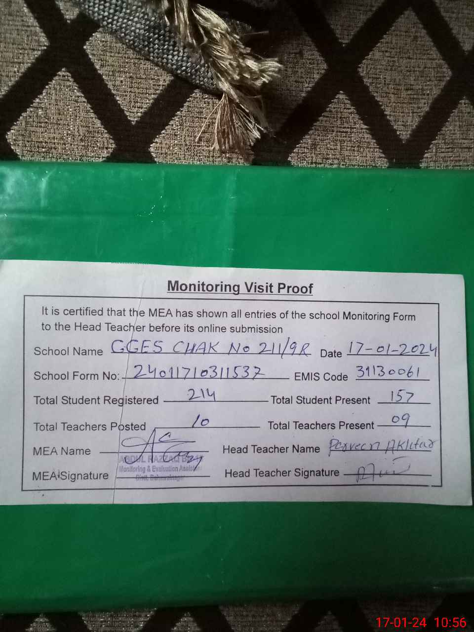 | Attendance Register | Head Teacher | MEA with School | Visit Proof |