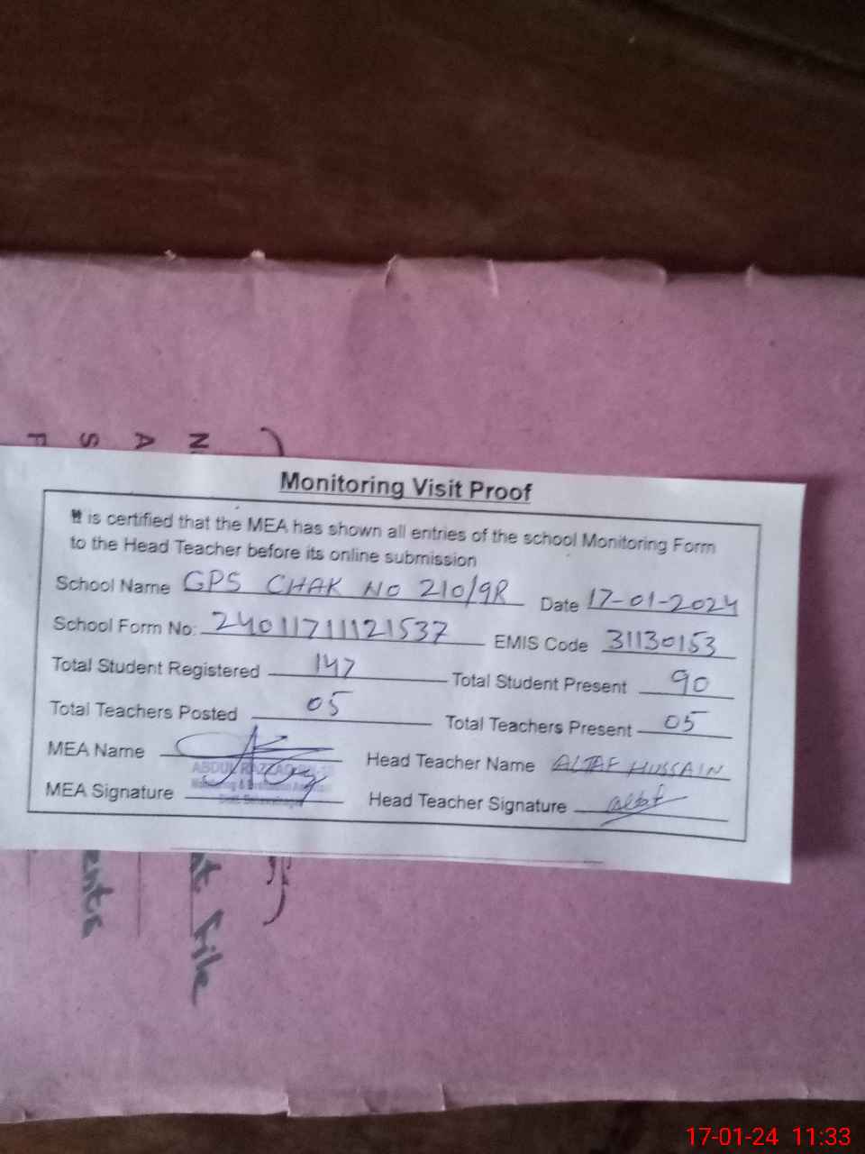 | Attendance Register | Head Teacher | MEA with School | Visit Proof |