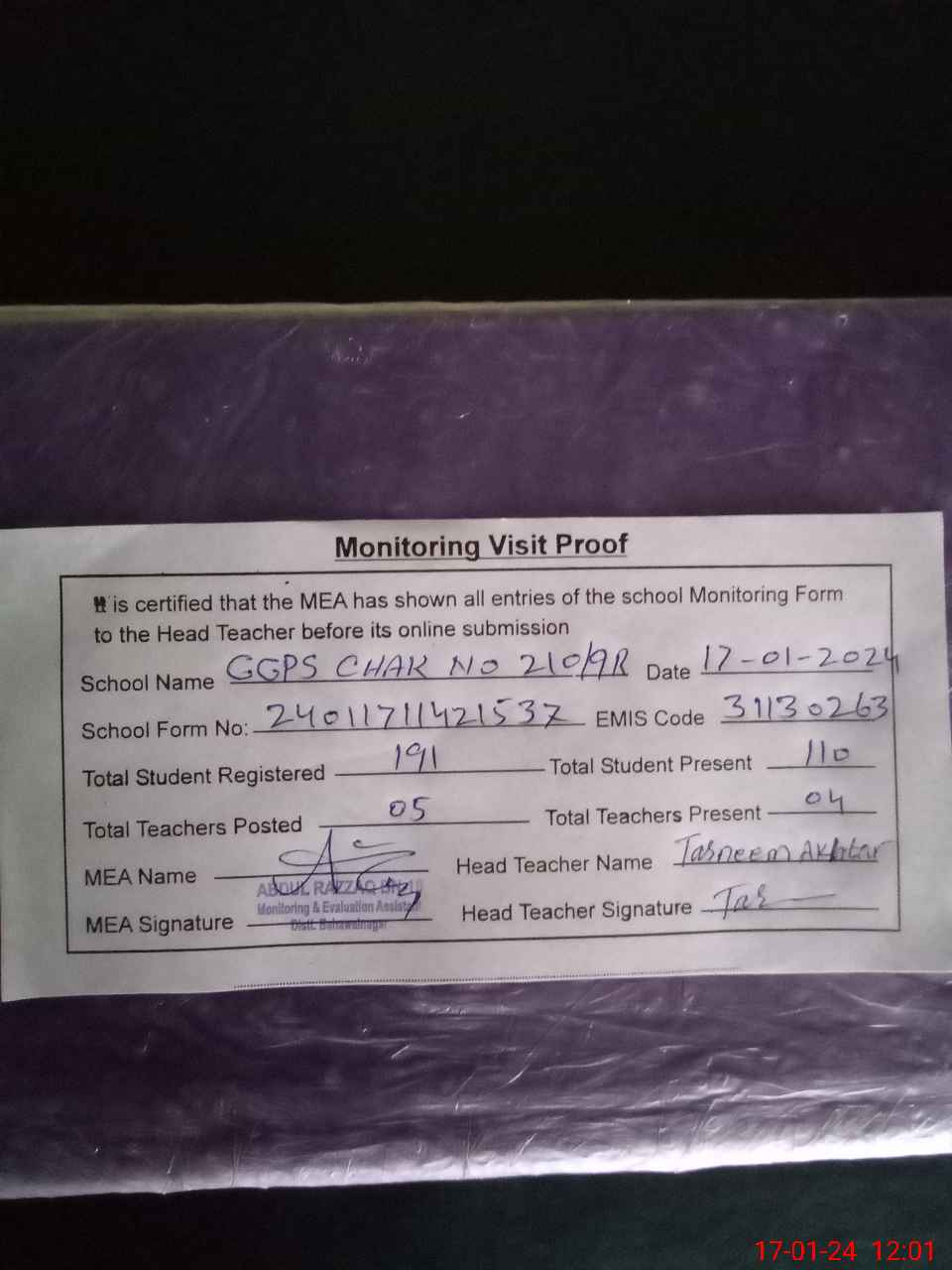 | EMIS Code: 31130263 | Name of School: GGPS CHAK NO. 210/9-R | |||