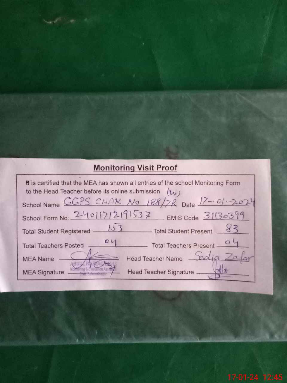 | Attendance Register | Head Teacher | MEA with School | Visit Proof |