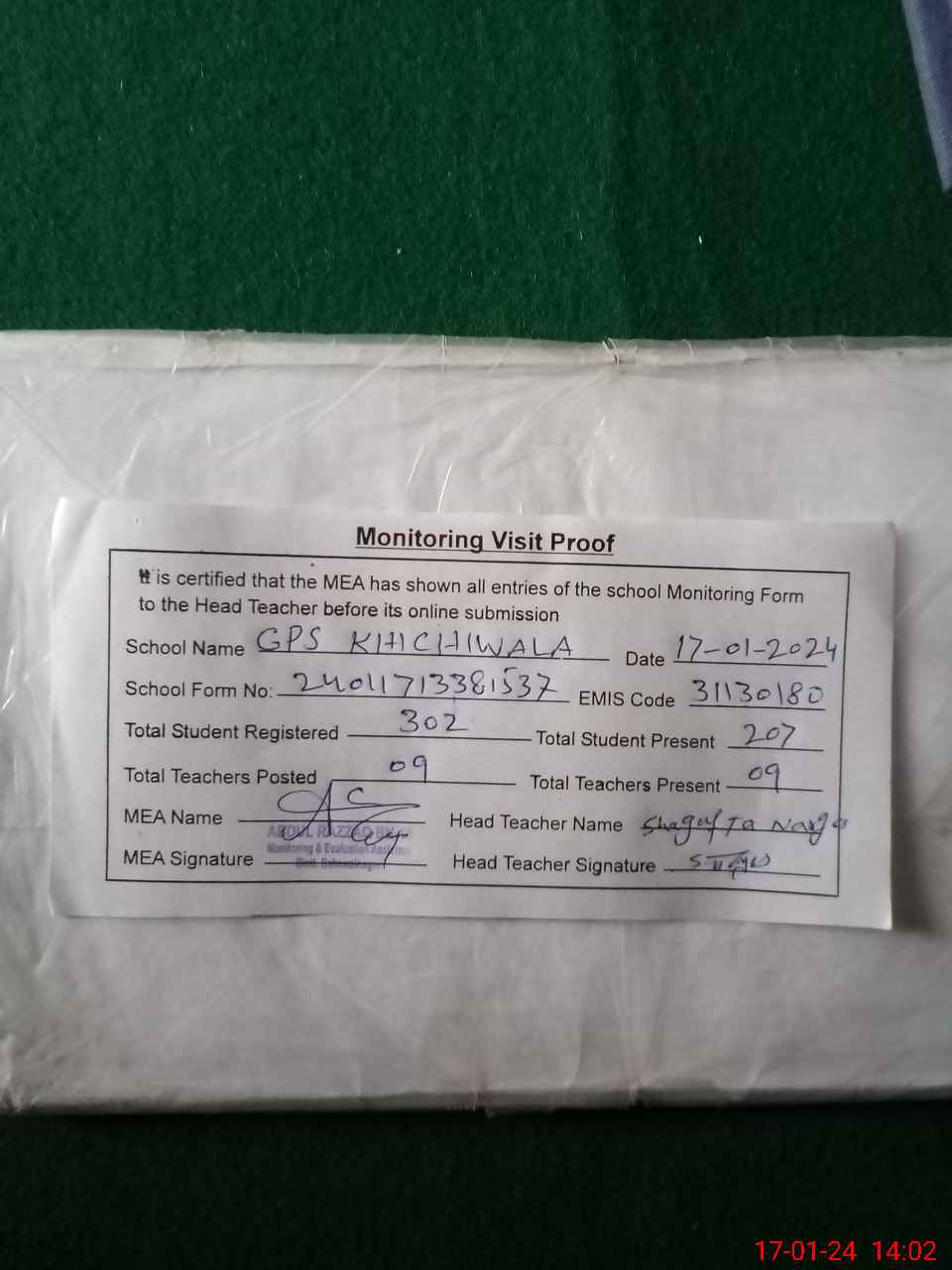 | Attendance Register | Head Teacher | MEA with School | Visit Proof |