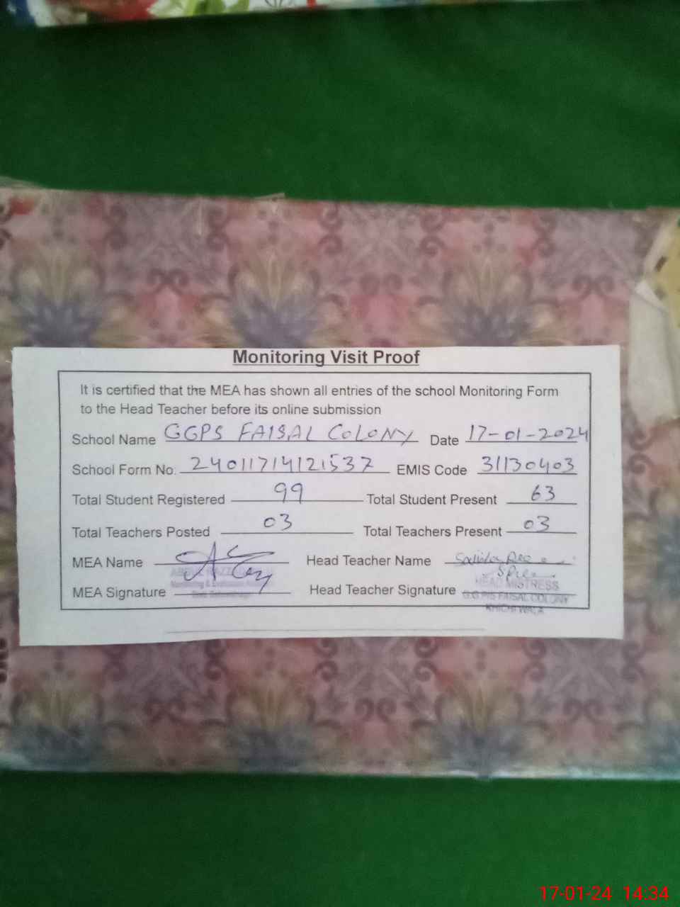 | Attendance Register | Head Teacher | MEA with School | Visit Proof |