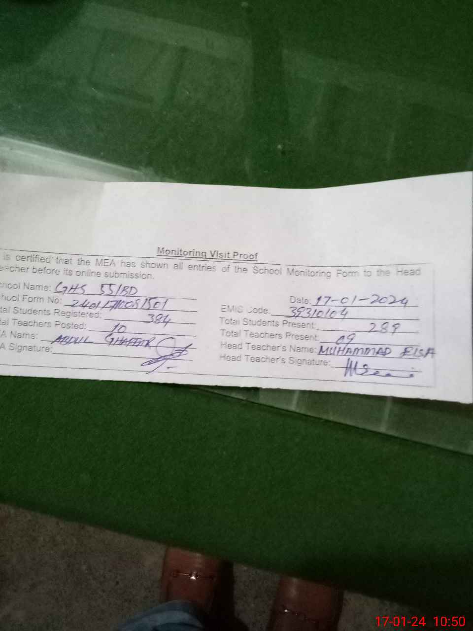 | Attendance Register | Head Teacher | MEA with School | Visit Proof |