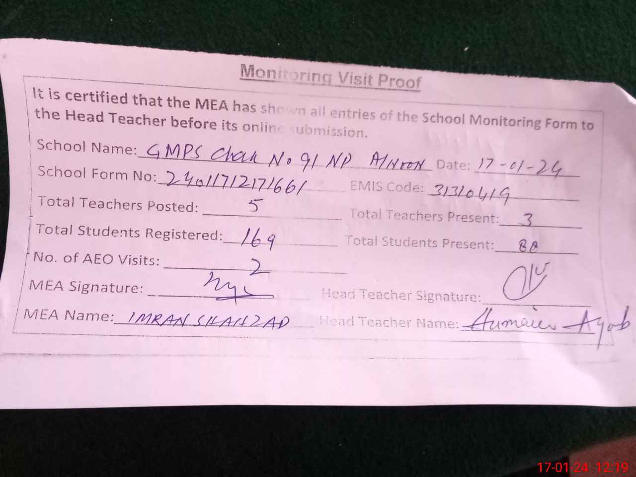 | EMIS Code: 31310419 | Name of School: GMPS CHAK NO 91/NP (After Noon) | |||