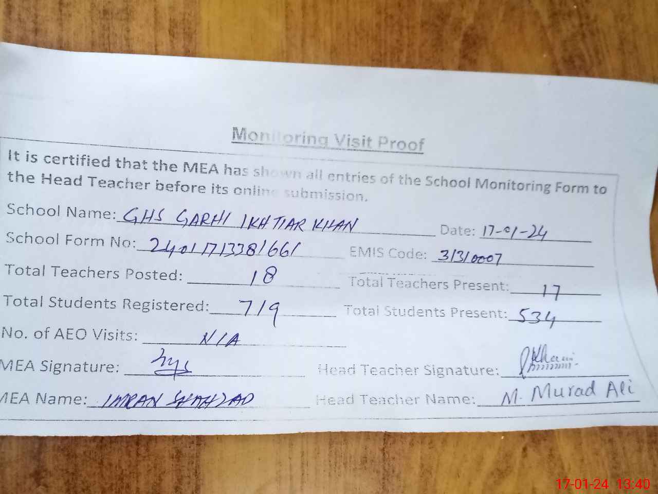 | Attendance Register | Head Teacher | MEA with School | Visit Proof |