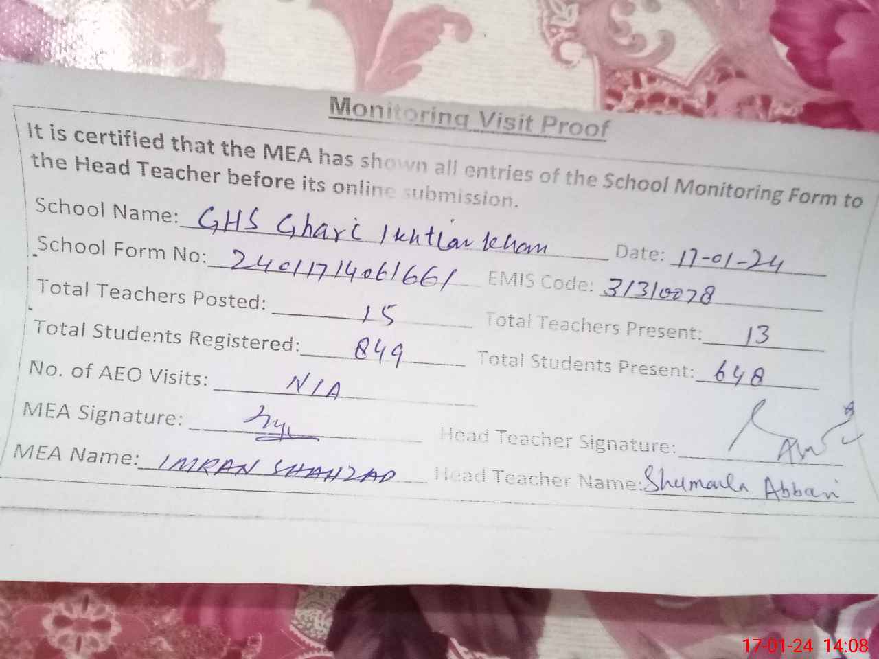 | Attendance Register | Head Teacher | MEA with School | Visit Proof |