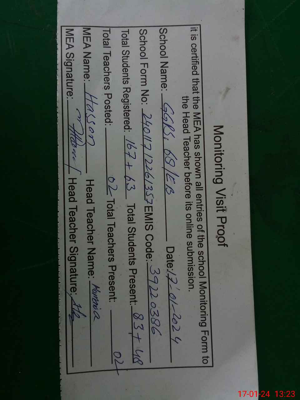 | EMIS Code: 39220386 | Name of School: GGPS 68 EB TEH ARIF WALA | |||